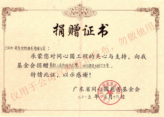 廣州市深華生物技術(shù)有限公司于2015年5月23日向廣東省同心圓慈善基金會捐贈善款人民幣十萬元整,用于建設(shè)鄉(xiāng)村衛(wèi)生室,改善鄉(xiāng)村醫(yī)療環(huán)境。給予了充分的關(guān)注與支持。